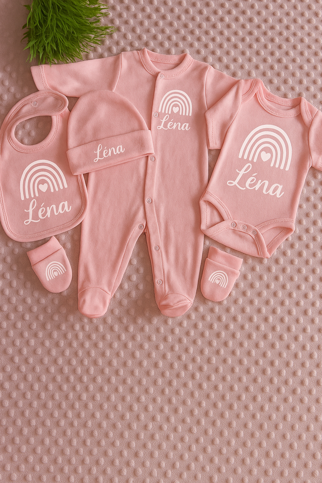 Composition : GrenouillĂšre bonnet moufles bavoir et bodyÂ