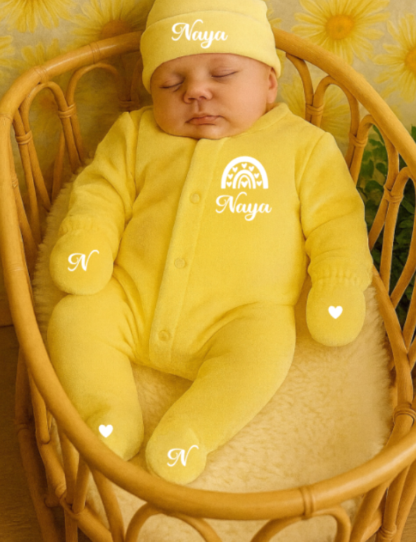 Composition : Grenouillère Bonnet et Moufles taille 0-3 mois en velours