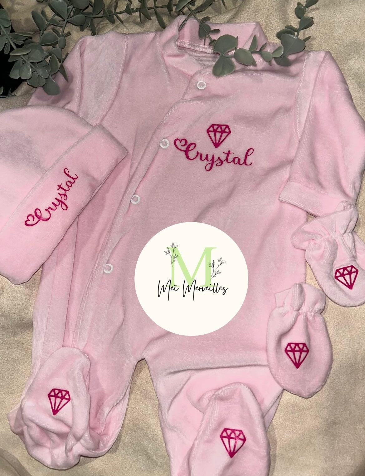 Composition : Grenouillère Bonnet et Moufles taille 0-3 mois en velours