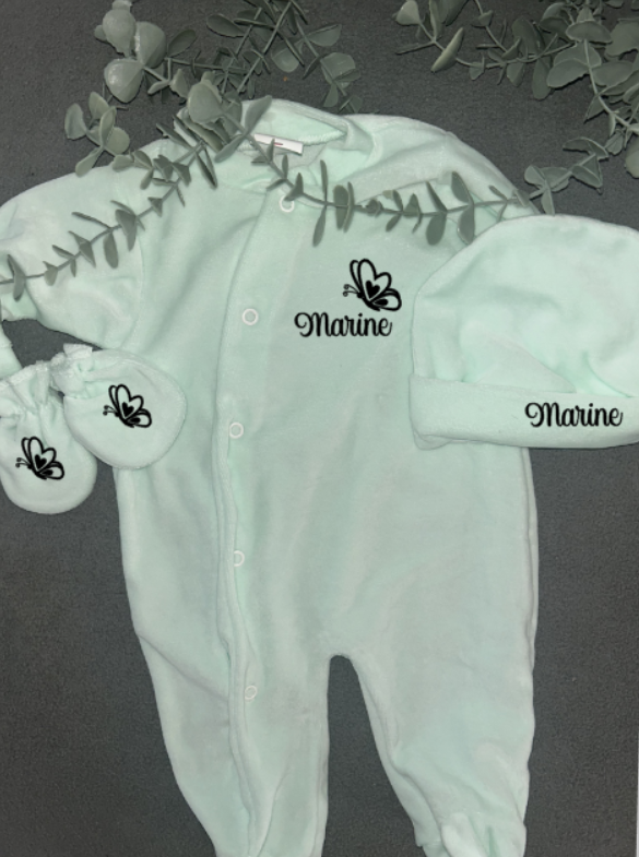 Composition : Grenouillère Bonnet et Moufles taille 0-3 mois en velours