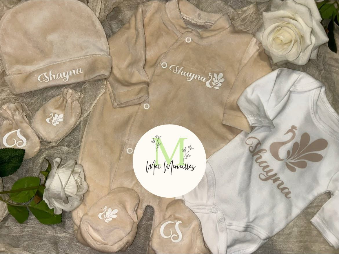 Composition : Grenouillère Bonnet et Moufles taille 0-3 mois en velours