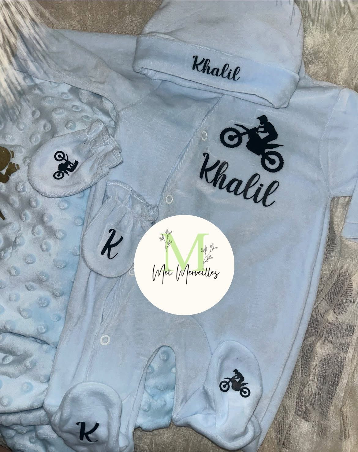 Composition : Grenouillère Bonnet et Moufles taille 0-3 mois en velours