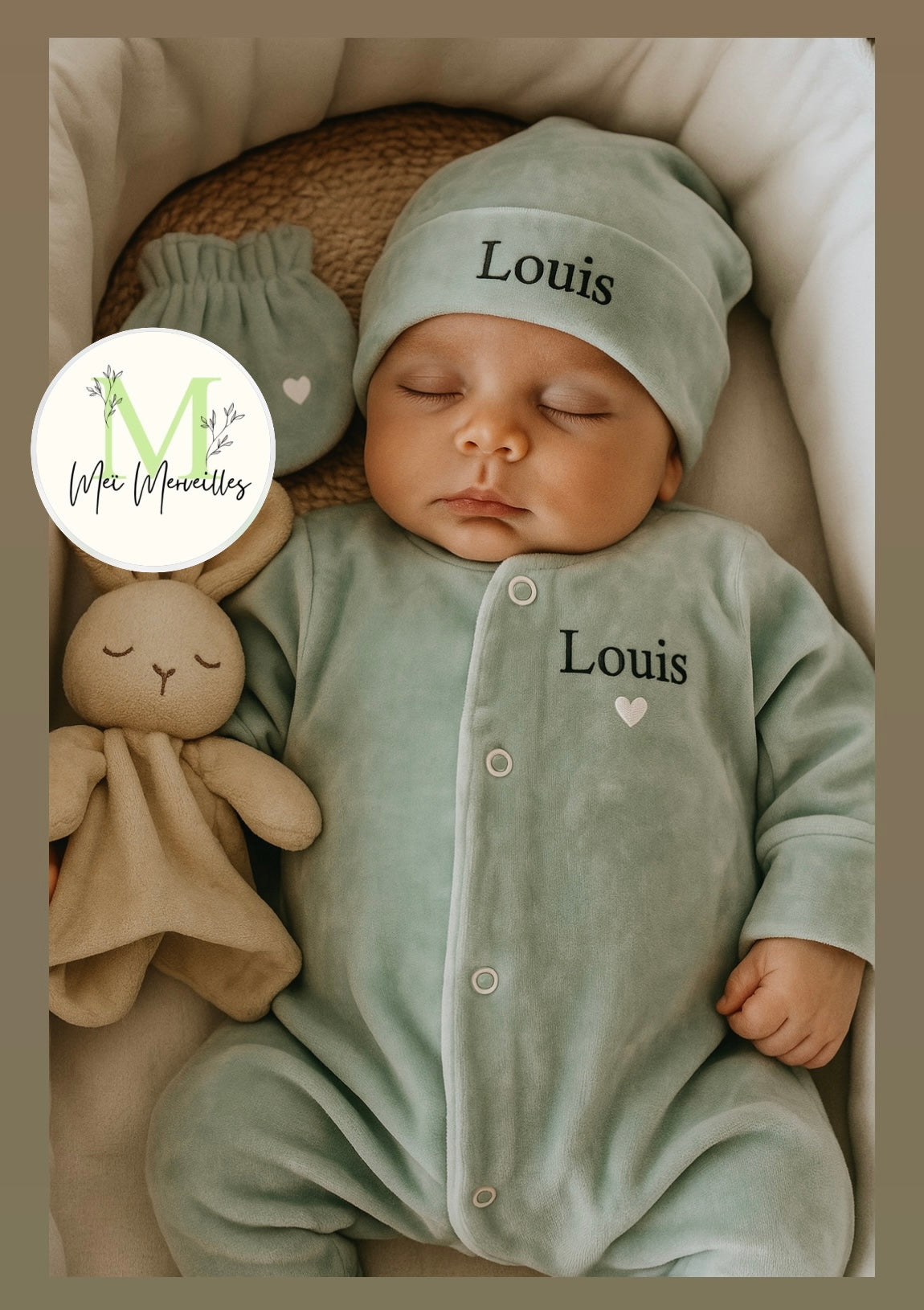 Composition : Grenouillère Bonnet et Moufles taille 0-3 mois en velours